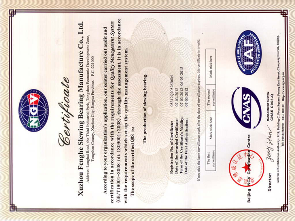 The products of our company have been already registered with the trade mark of “Fenghe”. The series of products produced by our company have passed the quality inspection identification of the national special type mechanical part quality testing and played a leading role in the industry. Our company is rewarded as “an enterprise which strictly abides by contracts and keeps promise” and “a enterprise with high quality”. At the same time, we have already passed through production part approval procedure (PPAP) training. Our company passed ISO***1:***8 quality system certification work in ***2, then passed ISO****1:***4 and OHSAS ****1:***7 in ***3. We are one of the main slewing bearing manufacturers in China. The relevant products have already passed product testing and certification of Chinese Classification Society (CCS).