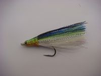 Name: Curtis Anchovy Category: Saltwater fly Wing: White bucktail, silver crystal flash, white fish hair, chartreuse fish hair, chartreuse crystal flash, blue fish hair, blue crystal flash Topping: Peacock hearl